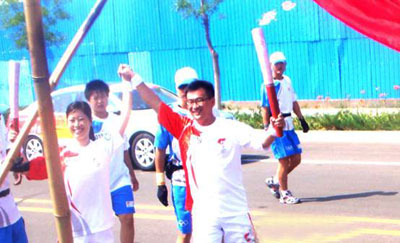 圖為火炬手汪英杰手持火炬?zhèn)鬟f