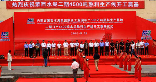 8月28日上午,蒙西水泥股份公司生產經營中心鮮花怒放、彩旗飄揚,內蒙古蒙西水泥集團蒙西工業園年產500萬噸熟料生產基地二期日產4500噸水泥熟料生產線開工奠基儀式在這里隆重舉行。